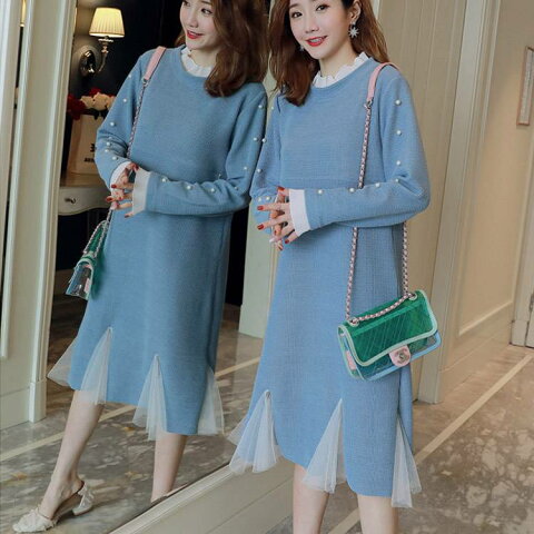 1枚でサマになるパール付きフェイクレイヤードマタニティ 兼授乳服 長袖ワンピースです。