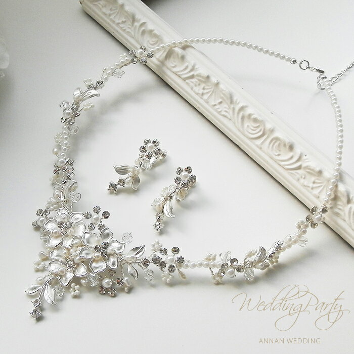 小さなパールモチーフで花嫁様にぴったり デザイン性の高いネックレスセット ネックレスとイヤリングのセットなのでコーディネートは完璧です。